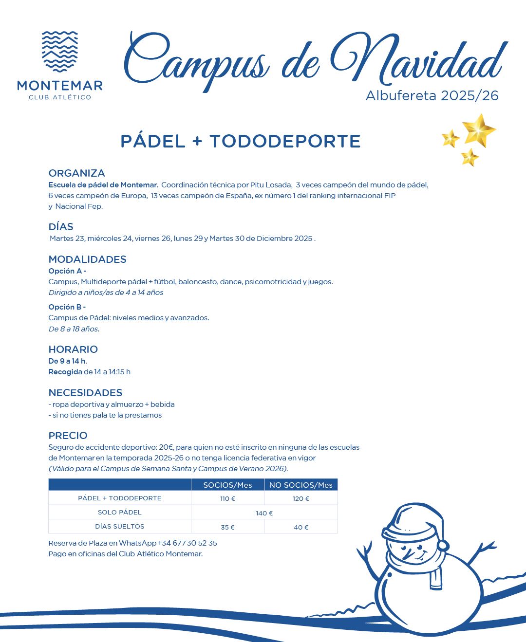 Con la garantía de Montemar y coordinado por Pitu Losada, 3 veces Campeón del Mundo de Pádel, 6 veces Campeón de Europa, 13 veces Campeón de España. Infórmate en el teléfono 677 305 235.
