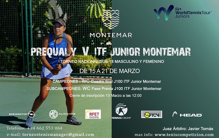 Comenzaremos con el torneo Pre-qualy (previo al ITF) para los jugadores que no tengan suficientes puntos para acceder al ITF directamente. Las fechas del torneo Pre-qualy son del 17 al 21 de Marzo. Los campeones del torneo pre-qualy ganarán una plaza para disputar la fase final del ITF Juniors J100 Montemar, y los Finalistas del torneo pre-qualy conseguirán el derecho a participar en la fase previa del ITF.